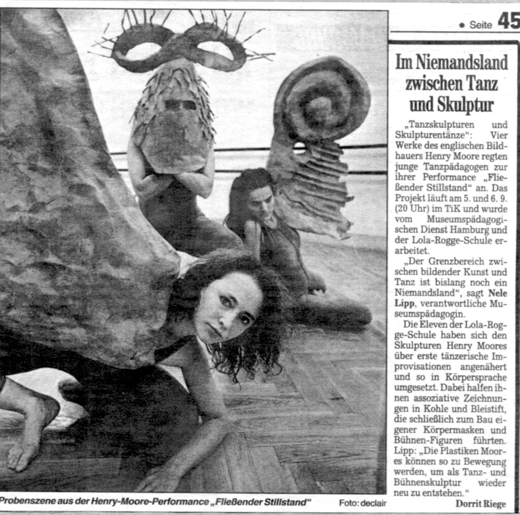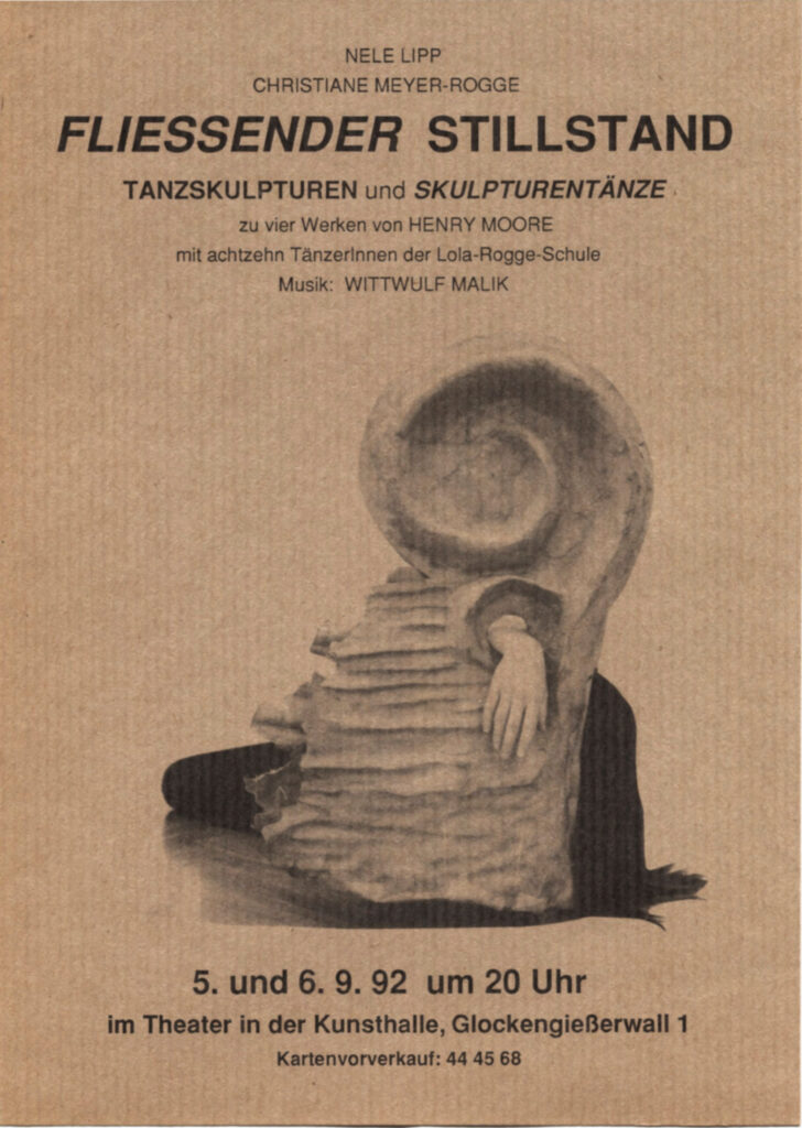 Ausgangspunkte dieser Tanz-Performance waren drei Skulpturen und eine Skulpturengruppe von Henry Moore. Eine davon befand sich in unmittelbarer Nähe der Lola Rogge Schule, deren Leiterin Christiane Meyer Rogge Turner zum zweiten Mal unsere Kooperationspartnerin war. Weitere Skulpturen standen in der Hamburger Kunsthalle und von einer verschaffte uns das Henry Moore Sculpture Trust (1988-1999) in Leeds Fotodokumente mit Ansichten aus verschiedenen Perspektiven.